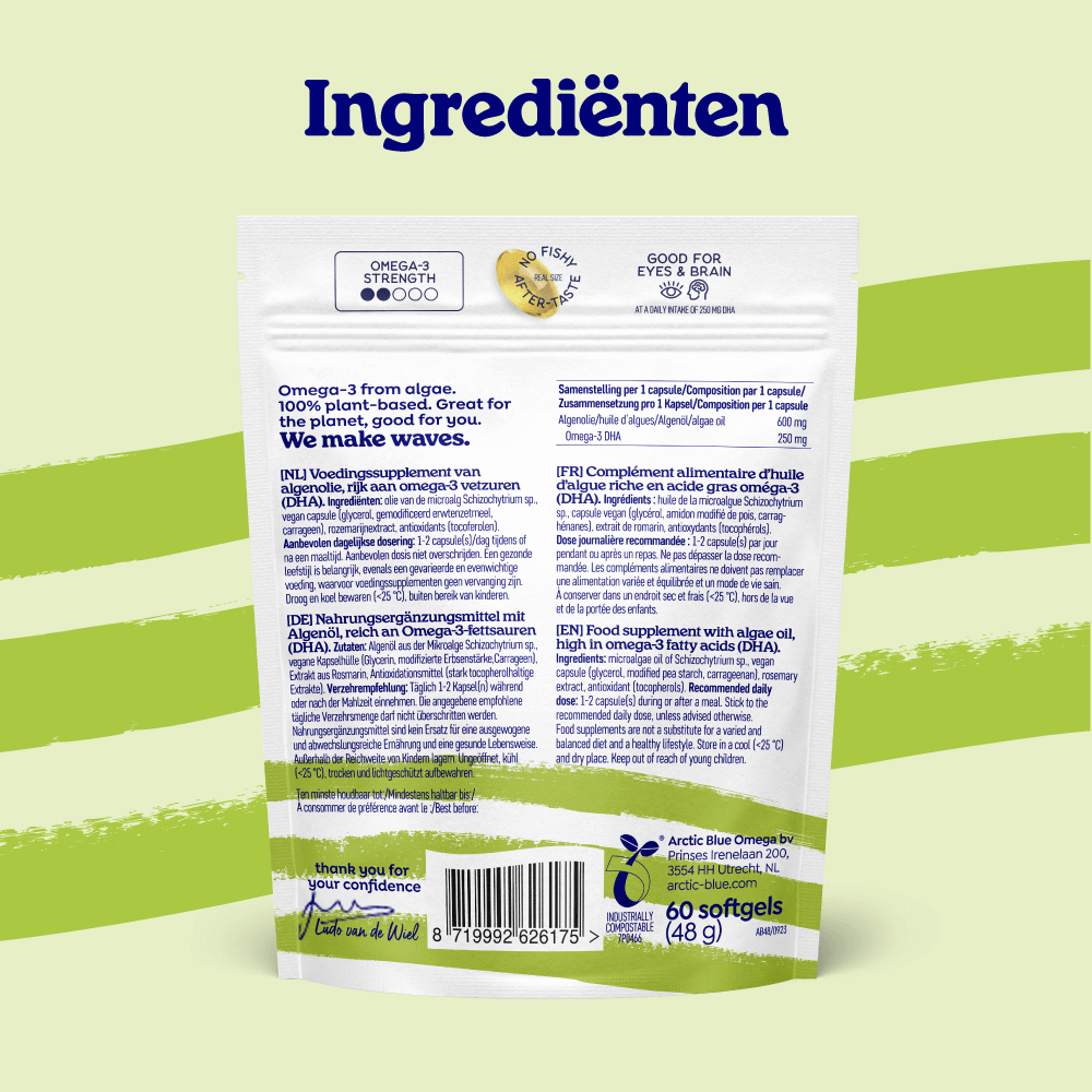 Algen zijn mini-plantjes die in water zelf Omega-3 vetzuren kunnen maken. Algen geven deze in de natuur door aan ‘vette’ vissen zoals haring en sardien, als ze gegeten worden. Hierdoor heeft algenolie de kracht van visolie. Omdat we algenolie capsules maken van gekweekte algen in een gecontroleerde omgeving, weten we ook zeker dat er geen verontreinigingen uit de ocean in kunnen zitten. Het capsuleomhulsel is ook plantaardig omdat de gelatine is vervangen door o.a. zeewier.