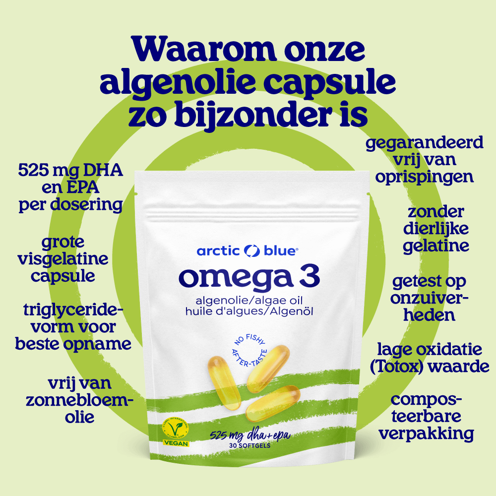 Algen zijn mini-plantjes die in water zelf Omega-3 vetzuren kunnen maken. Algen geven deze in de natuur door aan ‘vette’ vissen zoals haring en sardien, als ze gegeten worden. Hierdoor heeft algenolie de kracht van visolie. Omdat we algenolie capsules maken van gekweekte algen in een gecontroleerde omgeving, weten we ook zeker dat er geen verontreinigingen uit de ocean in kunnen zitten. Het capsuleomhulsel is ook plantaardig omdat de gelatine is vervangen door o.a. zeewier.