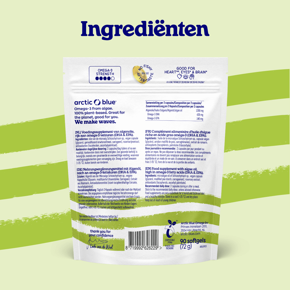 Schizochytrium sp. algenolie, glycerol, gemodificeerd zetmeel, carrageen (zeewierextract), dinatriumcarbonaat, water, natuurlijk rozemarijn extract, antioxidant (tocoferolen, ascorbylpalmitaat). Het vitamine E houdende natuurlijke antioxidant beschermt de gevoelige Omega-3 vetzuren. Plantaardige tocoferolen (o.a. alfatocoferol) is vitamine E en beschermt als antioxidant de gevoelige Omega-3 vetzuren. <1 mg per capsule. Ascorbylpalmitaat is de vetoplosbare vorm van vitamine C en beschermt (net als rozemarijn extract) als antioxidant ook de gevoelige Omega-3 vetzuren. < 1 mg per capsule. Schizochytrium sp. is de naam van de algensoort. Glycerol is een verdikkingsmiddel die samen met zetmeel (zie veelgestelde vragen) en carrageen het capsuleomhulsel vormt. Tezamen 25% van de hele capsule. Natriumcarbonaat is in voeding een standaard zuurteregelaar die in minuscule hoeveelheid (<3 mg) mede zorgt voor stevigheid van de capsule. De capsule is vrij van kunstmatige aroma’s en vrij van conserveringsmiddelen, kleur- of zoetstoffen.
