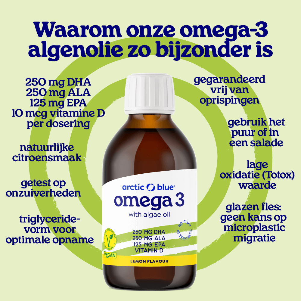 Olie gemaakt van algen, is de enige olie op aarde die dezelfde Omega-3 vetzuren EPA en DHA bevat als visolie. Dat is niet zo gek als je bedenkt dat vette vissoorten afhankelijk zijn van het eten van algen of het eten van kleine visjes die algen hebben gegeten. De smaak van de olie leent zich voor gebruik in bijv. yoghurt, maar ook om zo van de lepel te nemen. Geen kans op vissmaak of oprispingen.