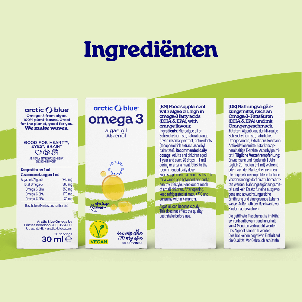 - 30 doseringen: 350 mg DHA, 170 mg EPA per 20 druppels (1 ml)
