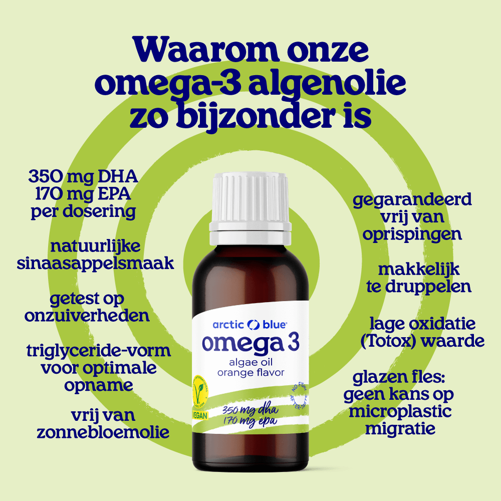 Omega-3 vetten behoren tot onze essentiële voedingsstoffen. Dat betekent dat, net als bij de meeste vitaminen, je ze via de voeding moet binnenkrijgen. Omdat veel mensen niet van de echte vette vis houden (haring, makreel, sardientjes), is een Omega-3 supplement zoals visolie of algenolie handig.