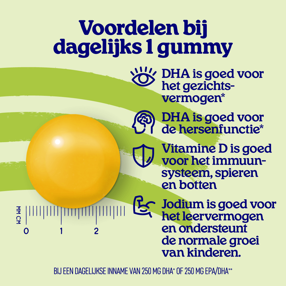 1 gummy bevat 250 mg Omega-3 DHA, 10 mcg (200% RI) vitamine D3 en 23 mcg jodium (15% RI). Een doosje bevat 30 dagdoseringen.
