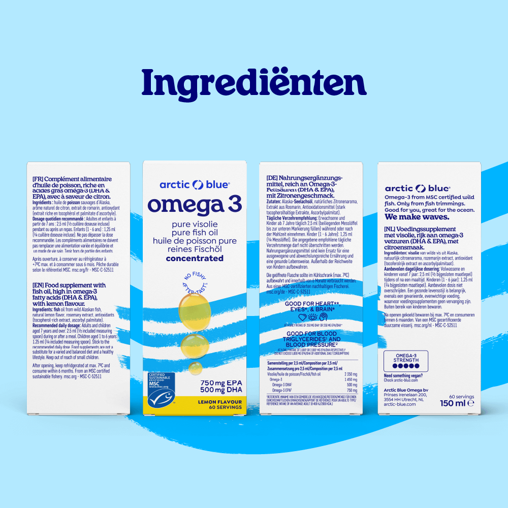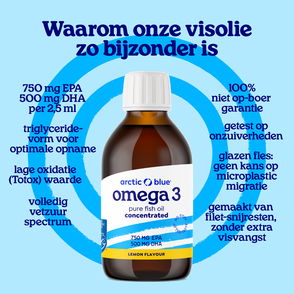 Wilde vette vis, zoals haring, sardientjes of makreel, is een hele goede bron van waardevolle onverzadigde vetzuren Omega-3 EPA en DHA én van vitamine D. Magere vis daarentegen (kibbeling, vissticks, tilapia en pangasius) bevat deze belangrijke voedingsstoffen nauwelijks. Pure Arctische MSC Visolie met vitamine D is er voor iedereen die moeite heeft met vette vis. De dagdosering (2,5 ml) (één dessert- of koffielepel) Pure Arctische Visolie bevat de Omega-3 vetten van (omgerekend) ongeveer één hele haring. Het is wetenschappelijk bewezen dat deze hoeveelheid EPA en DHA goed is voor het hart**, goed is voor je gezichtsvermogen* (helpt om scherp te blijven zien) en goed is voor je hersenfunctie*. Het gunstige effect wordt verkregen bij een dagelijkse inname van 250 mg DHA* of 250 mg EPA/DHA**. Dit zijn wettelijk goedgekeurde gezondheidsclaims. Maar liefst 20% van het vet in onze hersenen bestaat uit Omega-3 DHA; het is een belangrijke bouwsteen voor hersenen (zoals calcium dat is voor de botten). De vitamine D in de visolie is belangrijk voor het behoud van sterke botten en sterke tanden. Vitamine D zorgt mede voor een goede weerstand en speelt een rol bij het behoud van sterke spieren. Het is wetenschappelijk bewezen dat EPA en DHA ook goed zijn voor de bloeddruk1 en de triglyceriden2 (bloedvetten) spiegel. Het gunstige effect wordt verkregen bij een dagelijkse inname van 3000mg1 en 2000mg2 EPA/DHA. De dagelijkse inname van EPA en DHA mag dan niet meer dan 5000 mg bedragen.