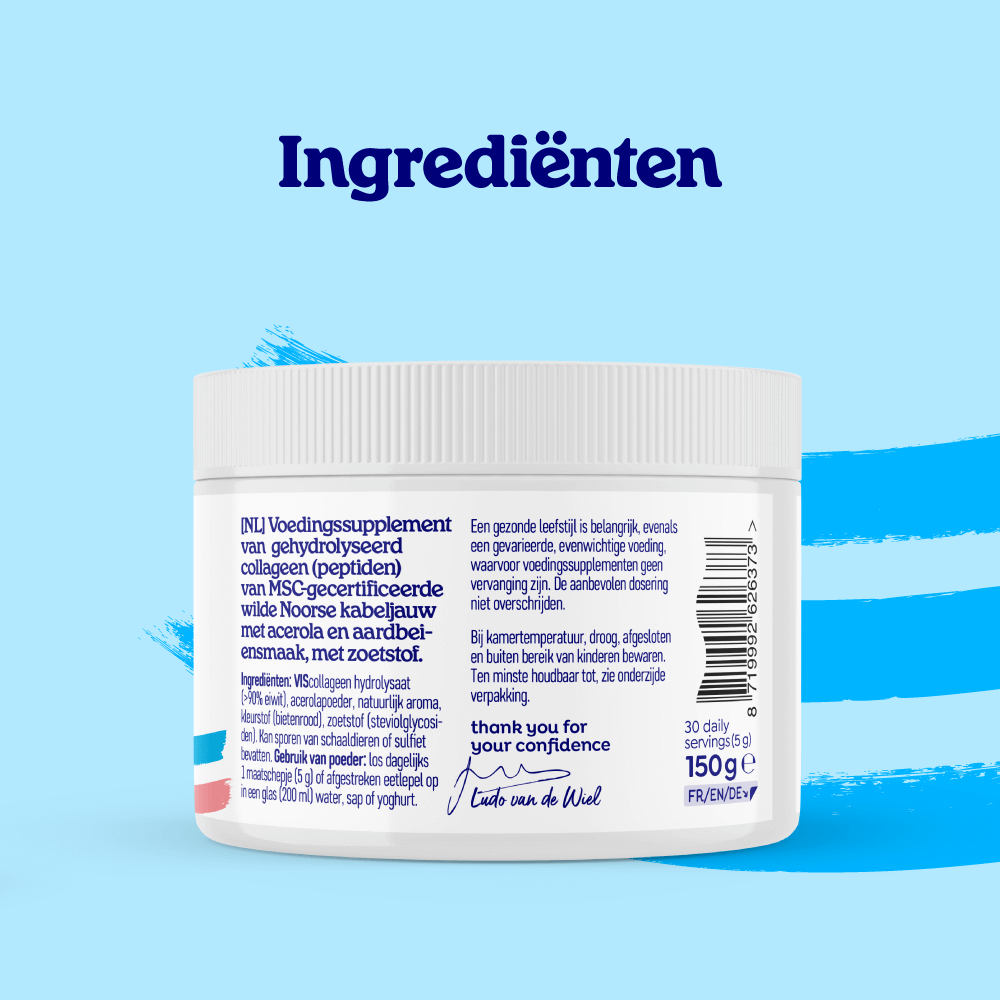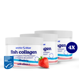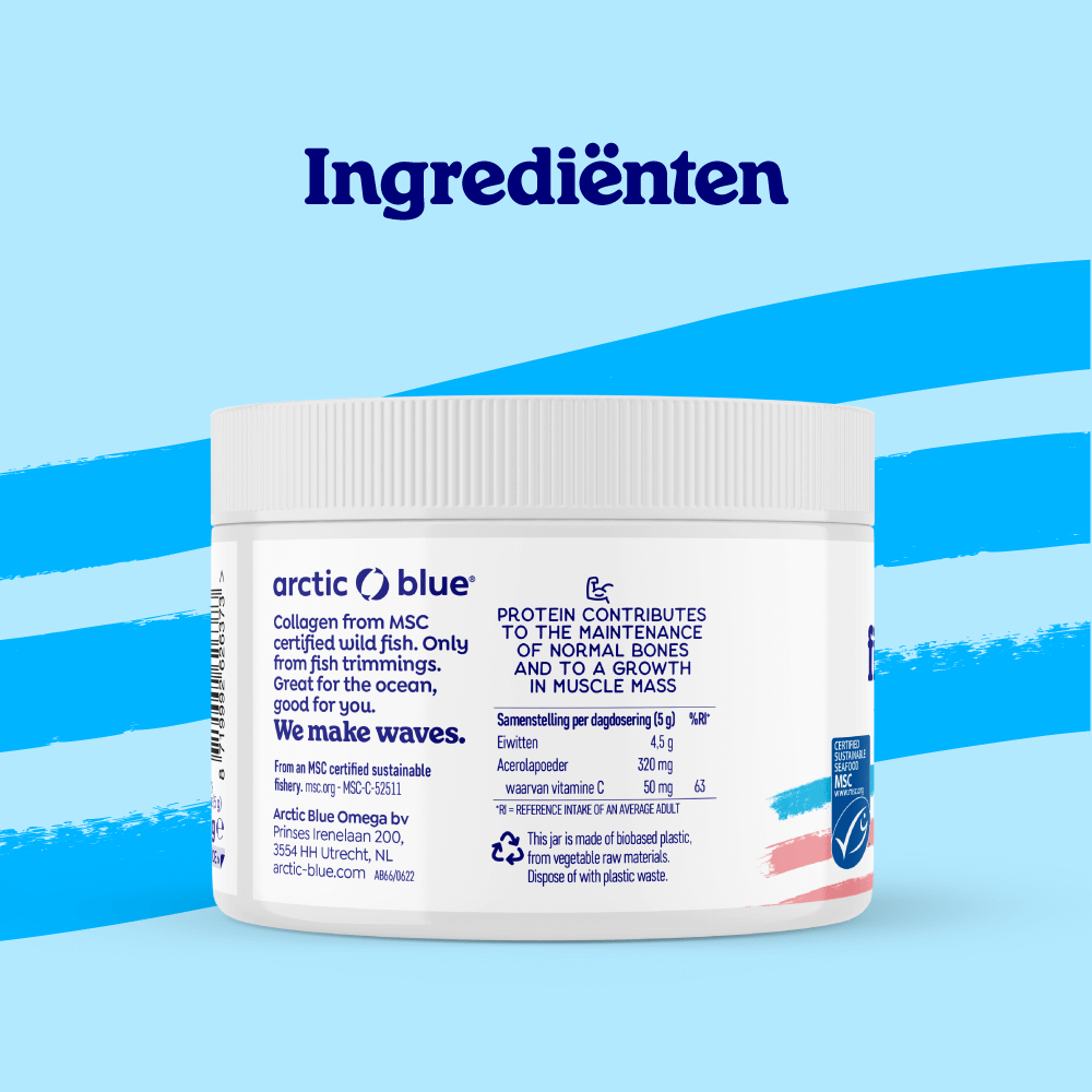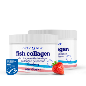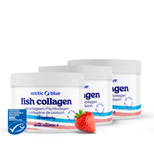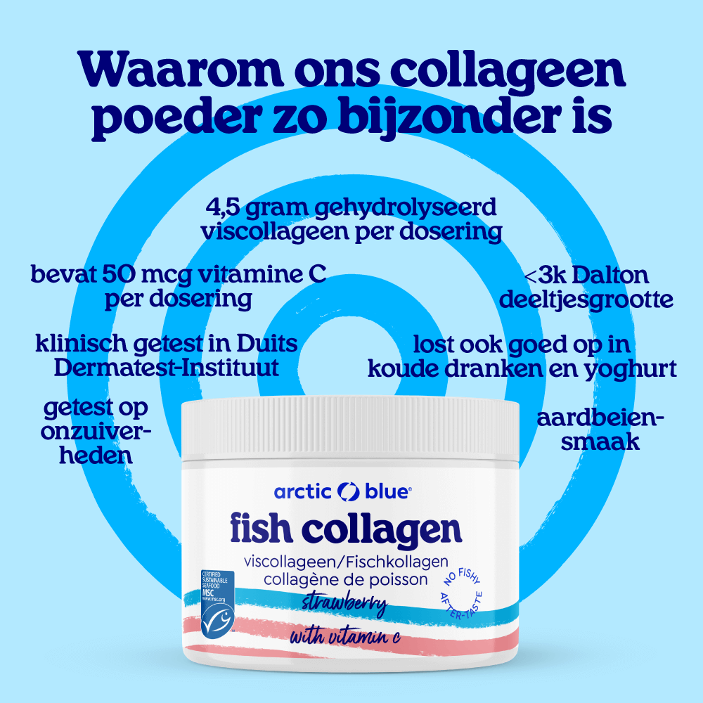 Vis bevat naast de gezonde goede vetten ook hoogwaardige eiwitten. Eiwitten zijn onze bouwstoffen. Naarmate we ouder worden of gaan sporten, worden ze belangrijker. Van al het eiwit in ons lichaam is 30% collageen. Bindweefsel geeft ons structuur en stevigheid. Het belangrijkste onderdeel hiervan is collageen. Ook huid, botten, pezen, kraakbeen, gewrichtsbanden, bloedvaten en tanden bestaan voor een groot gedeelte uit collageen. Naarmate we ouder worden, neemt de collageen productie af. Collageen hydrolysaat betekent dat het viscollageen in kleinere stukjes eiwit is geknipt (gehydrolyseerd), de zogenaamde peptiden. Elk collageen supplement (poeder of capsules) is een hydrolysaat. In ons lichaam knippen we de peptiden verder in losse aminozuren die in het bloed worden opgenomen. De reden waarom Arctic Blue voor viscollageen kiest, is dat deze het meest vergelijkbaar is met menselijk collageen, wat hier wordt uitgelegd. Daarnaast is Arctic Blue het enige merk met een keurmerk voor het collageen poeder, dat bewijst dat het afkomstig is van wilde vis (en niet van bijv. kweek-tilapia of koeien).