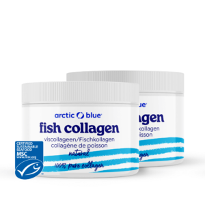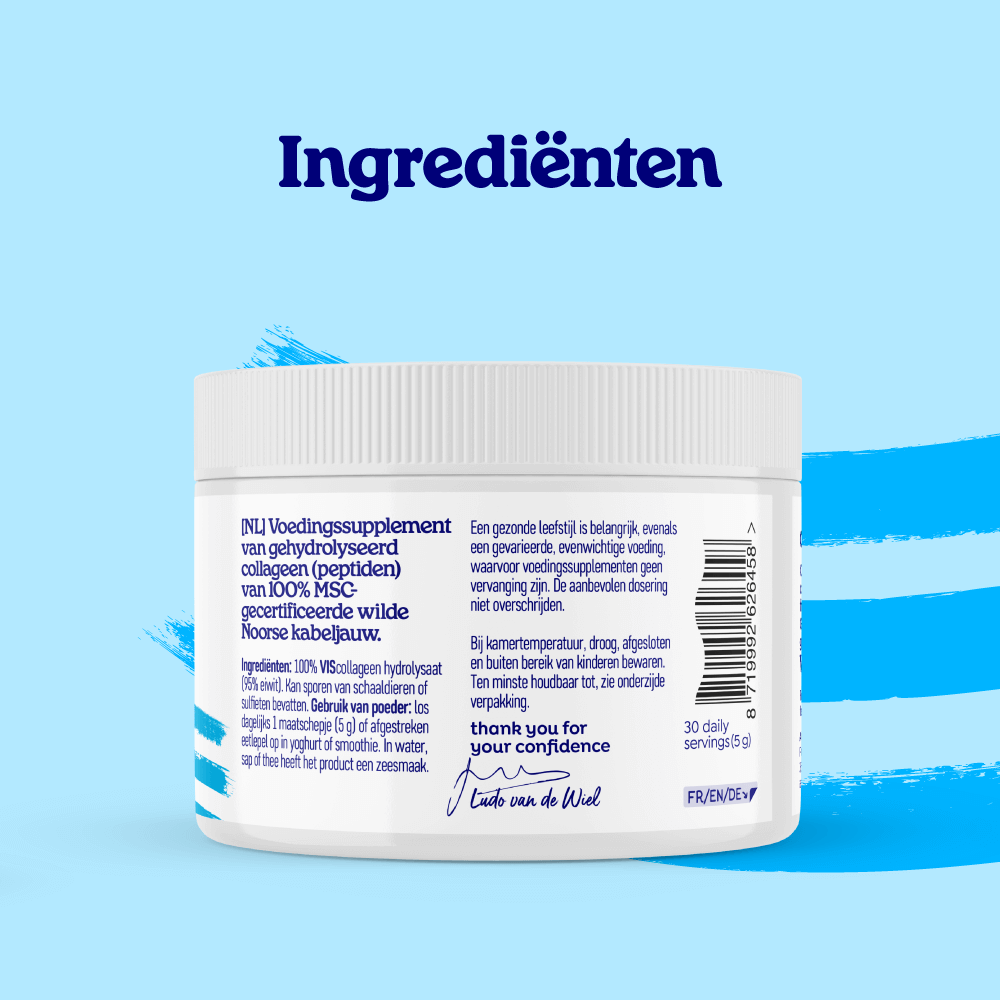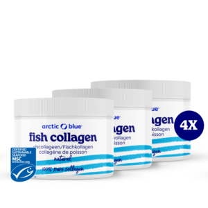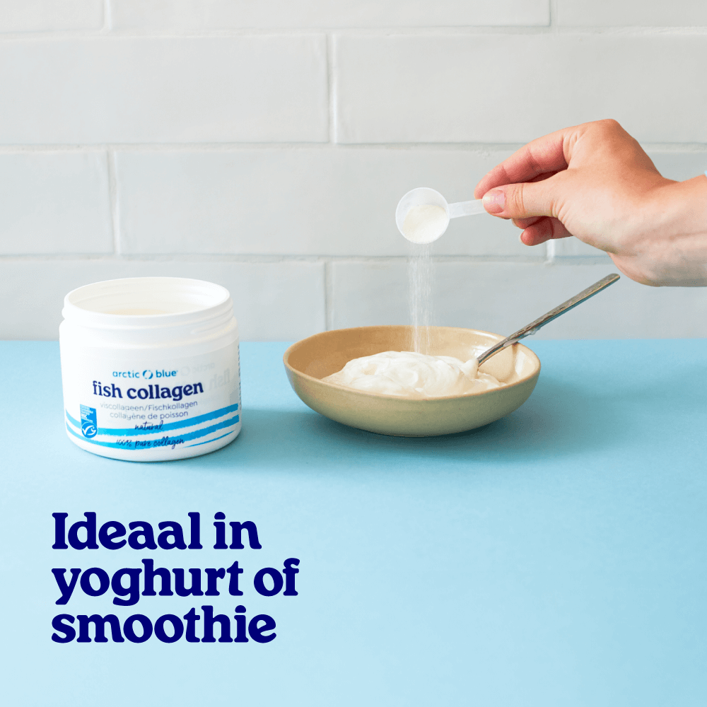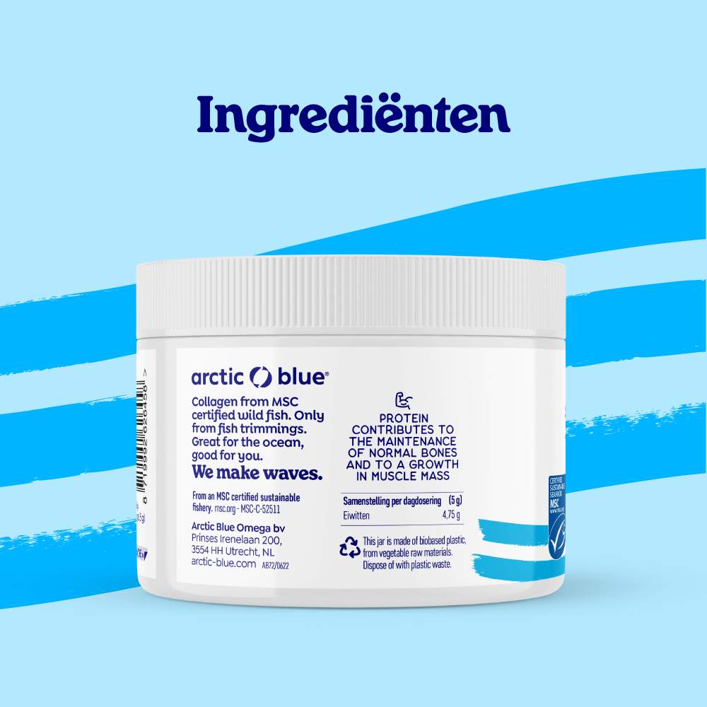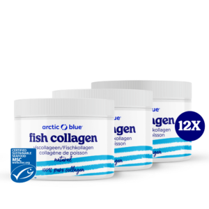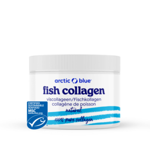 Collageen hydrolysaat betekent dat het viscollageen in kleinere stukjes eiwit is geknipt (gehydrolyseerd), de zogenaamde peptiden. Elk collageen supplement (poeder of capsules) is een hydrolysaat. In ons lichaam knippen we de peptiden verder in losse aminozuren die in het bloed worden opgenomen. De reden waarom Arctic Blue voor viscollageen kiest, is dat deze het meest vergelijkbaar is met menselijk collageen, wat hier wordt uitgelegd. Daarnaast is Arctic Blue het enige merk met een keurmerk voor het collageen poeder, dat bewijst dat het afkomstig is van wilde vis (en niet van bijv. kweek-tilapia of koeien).